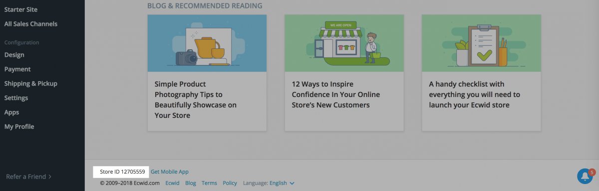 The Store ID is the unique number of your Ecwid store account. You will need this number to connect this project file to your Ecwid account. The Store ID is displayed in your Ecwid Control Panel in the bottom left corner of every page of the control panel.