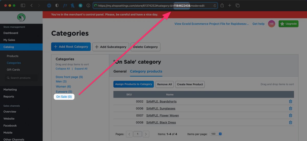 In your Ecwid store, each category you create has its own unique ID. That’s the number that you can see if you open a category in your storefront and look at the end of the link in the browser address bar. You can also get the category ID by logging into your Ecwid account.